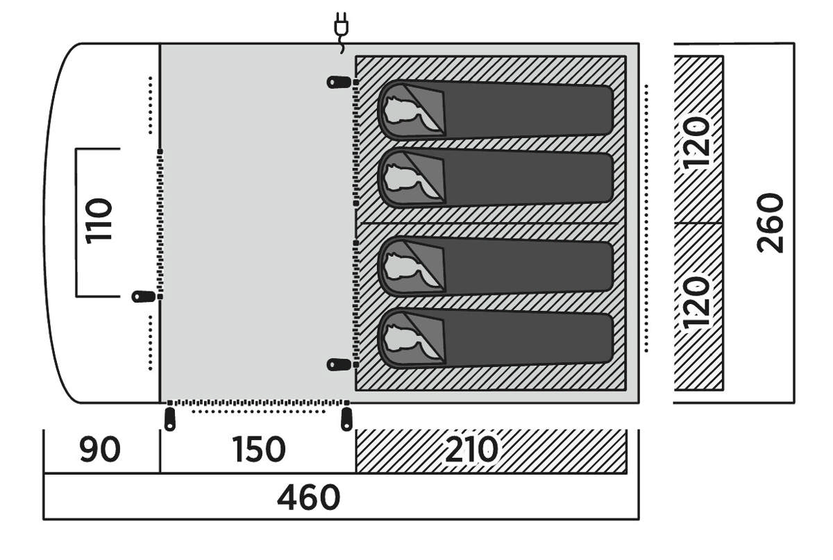 A spacious living area, rain-safe front entrance, and organiser pockets keep essentials within reach. A sewn-in groundsheet blocks draughts and bugs, and a versatile side entrance with a full mesh door enhances convenience. Skarvan 4 is perfect for family adventures.
